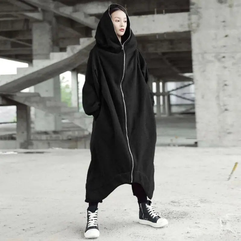 Oversized S-5XL Women Loose Add Velvet Hooded Coats Autumn Winter Long Lantern Sleeve Solid Zip Up X-Long Sweatshirt Overcoats